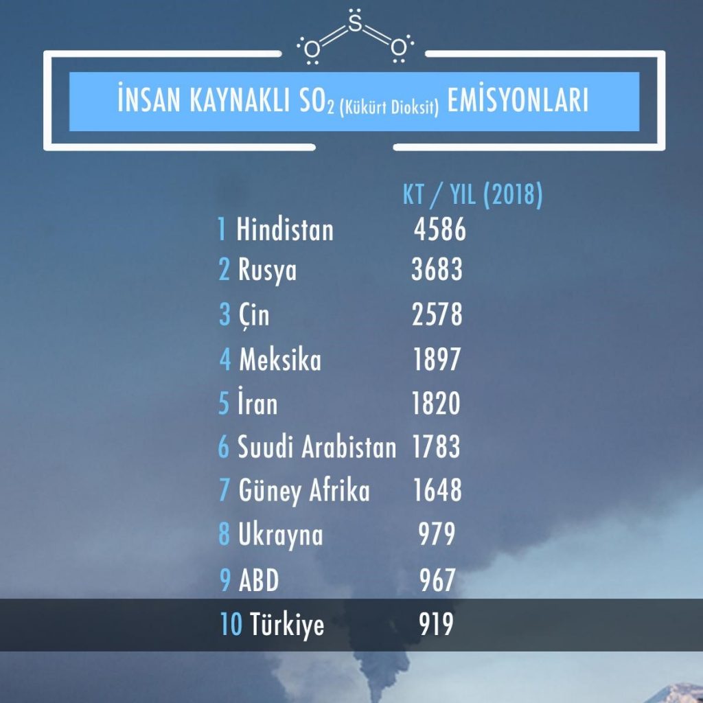 Greenpeace Hindistan’ın NASA Ozon Görüntüleme Aracı (OMI) görüntülerinden faydalanarak hazırladığı rapor, 2018 yılında Türkiye’nin insan faaliyetleri kaynaklı kükürtdioksit (SO2) emisyonlarında dünyada 10. sırada bulunduğunu gösteriyor. Rapordaki bilgilere göre geçtiğimiz yıl dünyada en çok kükürtdioksit emisyonuna sebep olan ilk 10 ülke şu şekilde: Hindistan, Rusya, Çin, Meksika, İran, Suudi Arabistan, Güney Afrika, Ukrayna, ABD, Türkiye.