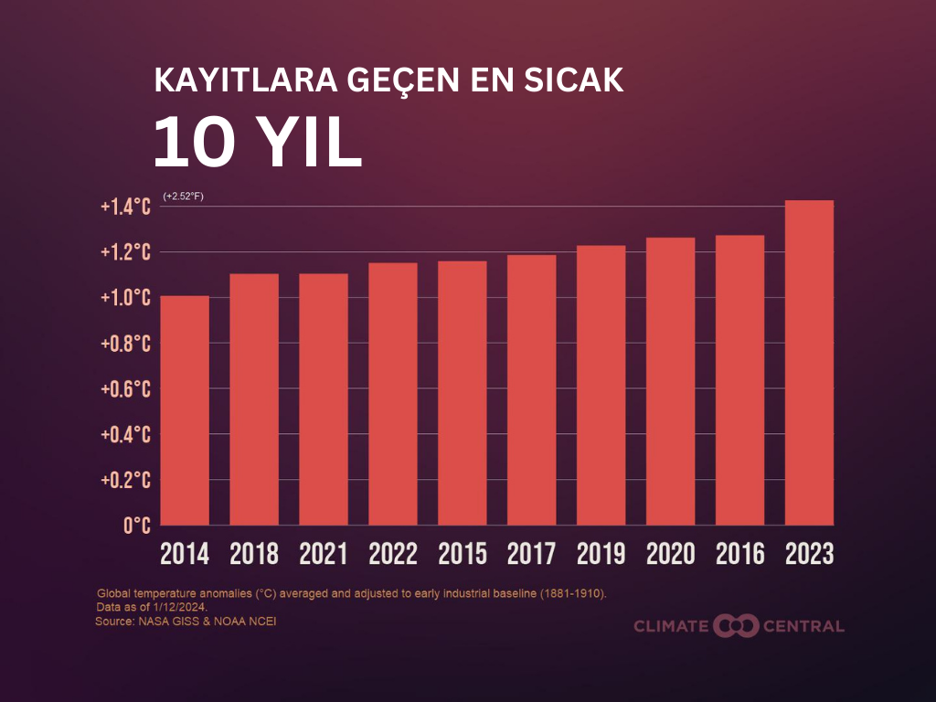 Climate Central adlı araştırma kuruluşunun NOAA ve NASA verileri ile yaptığı kıyaslama ise,  üst üste yaşanan en sıcak on yılın 2014-2023 yılları arasında gerçekleştiğini gösteriyor.